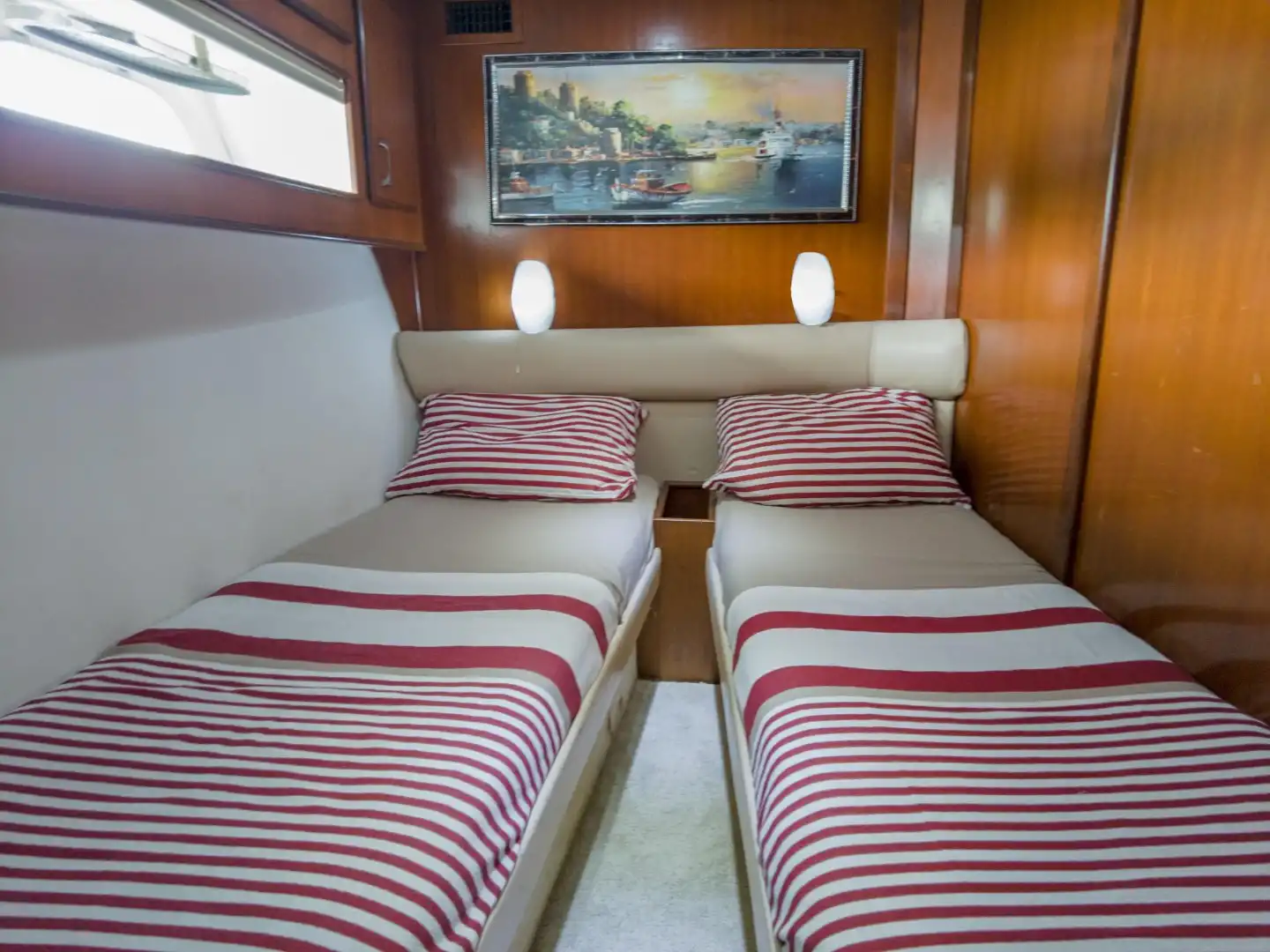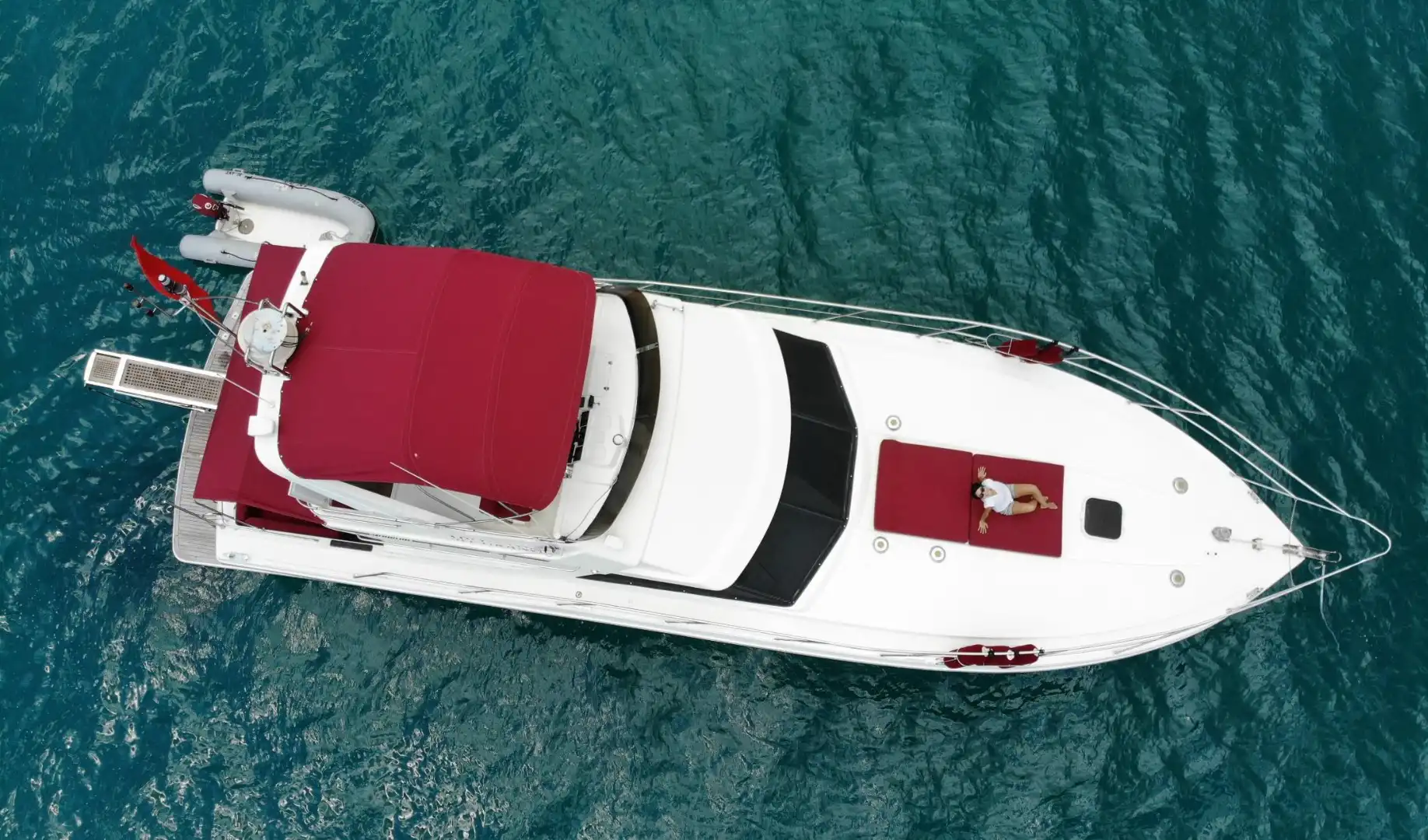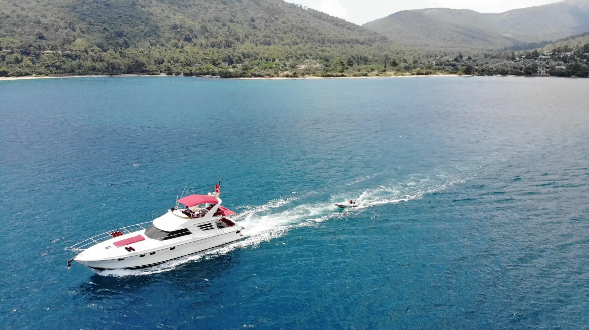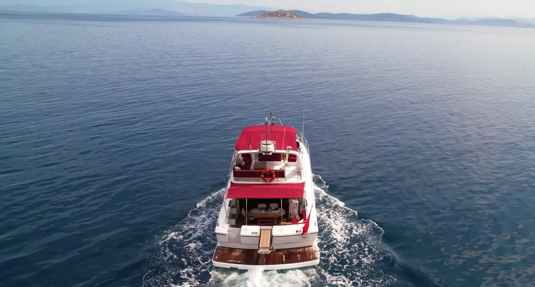 Bodrum'un turkuaz koylarında 17.5 metre Fairline 55 motoryat ile lüks bir deniz tatili yaşayın. 1 double ve 2 twin yataklı olmak üzere 3 klimalı kabiniyle 6 kişiye konaklamalı, günlük turlarda 12 kişiye kadar hizmet vermektedir. 2x435 HP Caterpillar motorlar güçlü ve akıcı bir seyir sunarken, 16 KW Onan jeneratör kesintisiz konfor sağlıyor. 4.60 metre genişliğindeki zarif İngiliz tasarımı, şık iç mekanları ve geniş güverte alanlarıyla Fairline 55, performans ve estetiği bir arada sunuyor. Kaptan ve gemiciden oluşan 2 kişilik profesyonel mürettebat eşliğinde Bodrum'un saklı koylarını keşfedin.