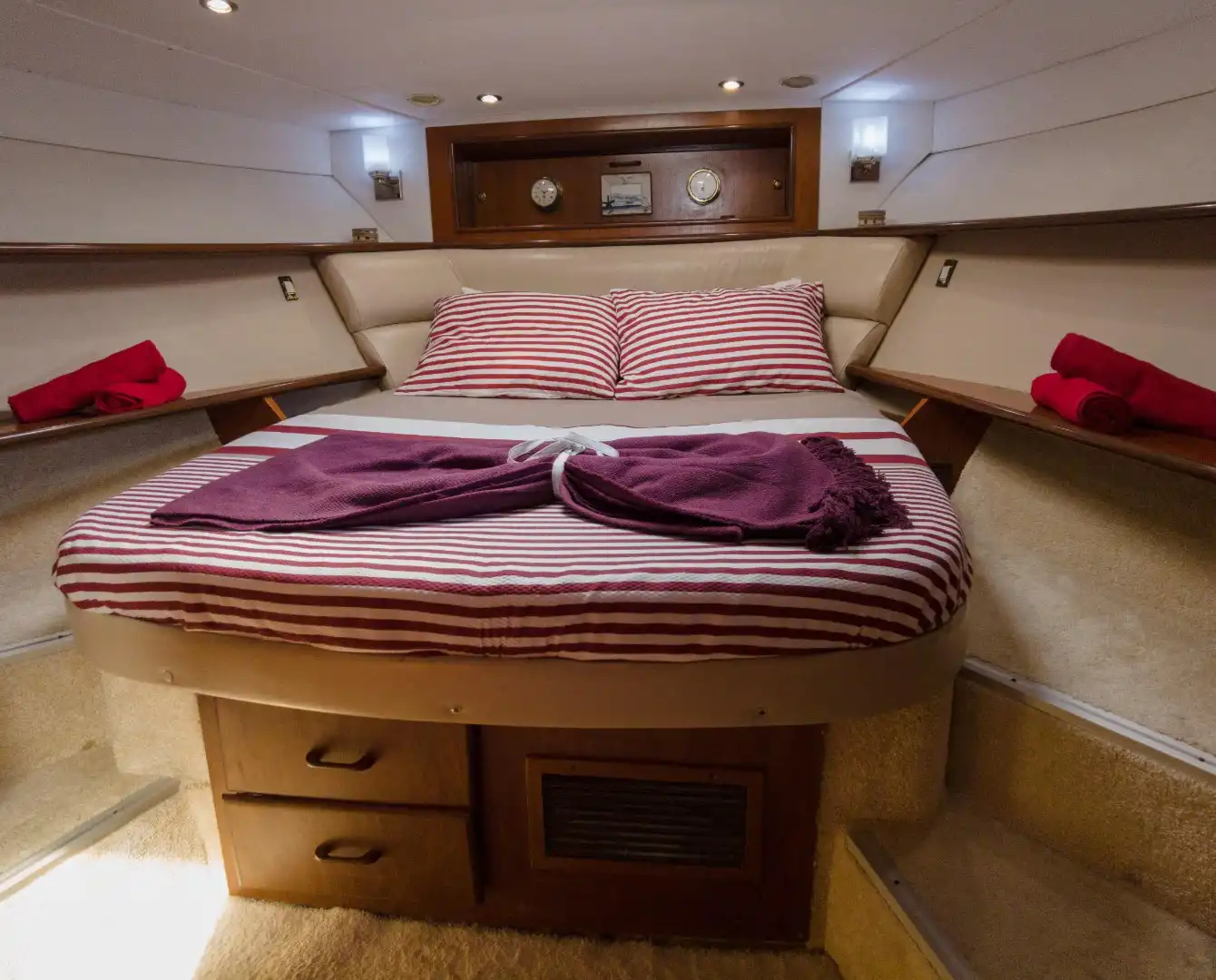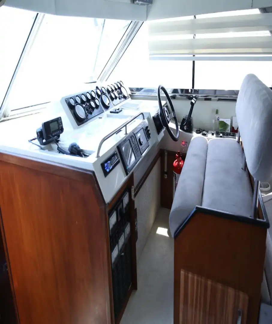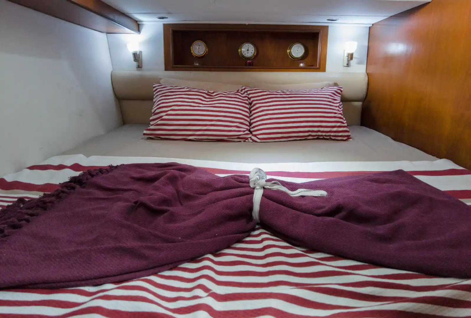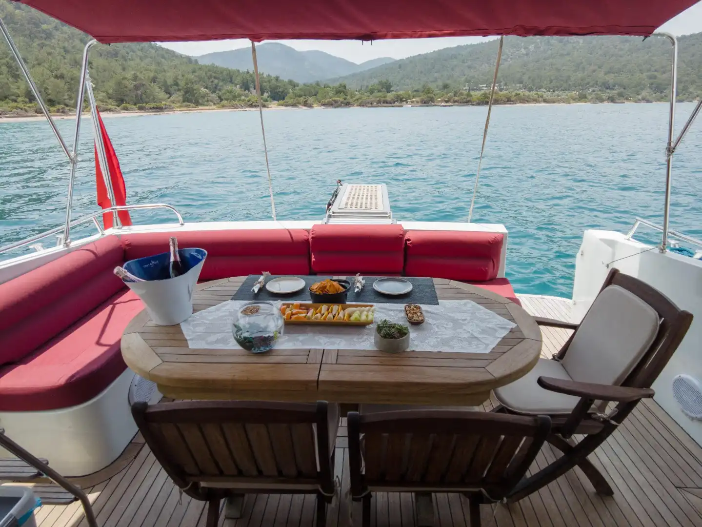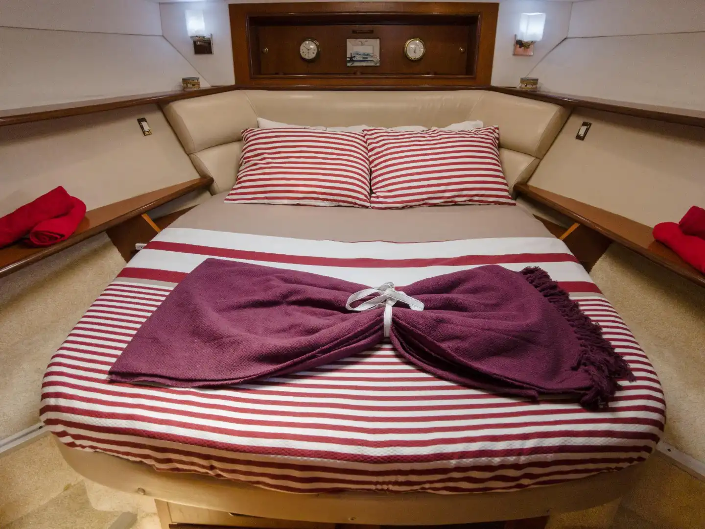 Bodrum'un turkuaz koylarında 17.5 metre Fairline 55 motoryat ile lüks bir deniz tatili yaşayın. 1 double ve 2 twin yataklı olmak üzere 3 klimalı kabiniyle 6 kişiye konaklamalı, günlük turlarda 12 kişiye kadar hizmet vermektedir. 2x435 HP Caterpillar motorlar güçlü ve akıcı bir seyir sunarken, 16 KW Onan jeneratör kesintisiz konfor sağlıyor. 4.60 metre genişliğindeki zarif İngiliz tasarımı, şık iç mekanları ve geniş güverte alanlarıyla Fairline 55, performans ve estetiği bir arada sunuyor. Kaptan ve gemiciden oluşan 2 kişilik profesyonel mürettebat eşliğinde Bodrum'un saklı koylarını keşfedin.