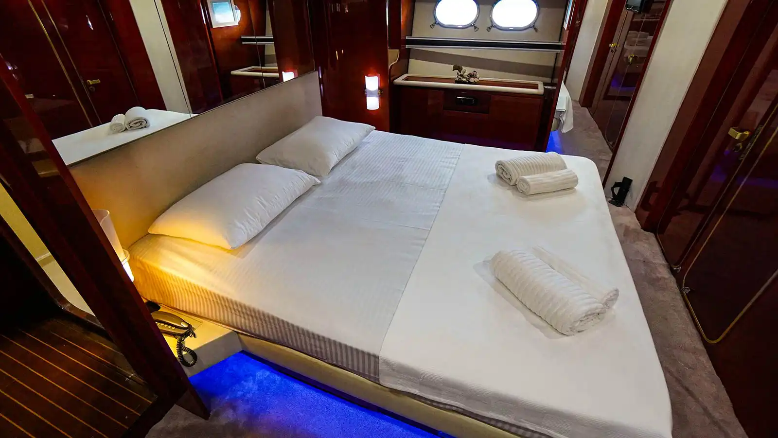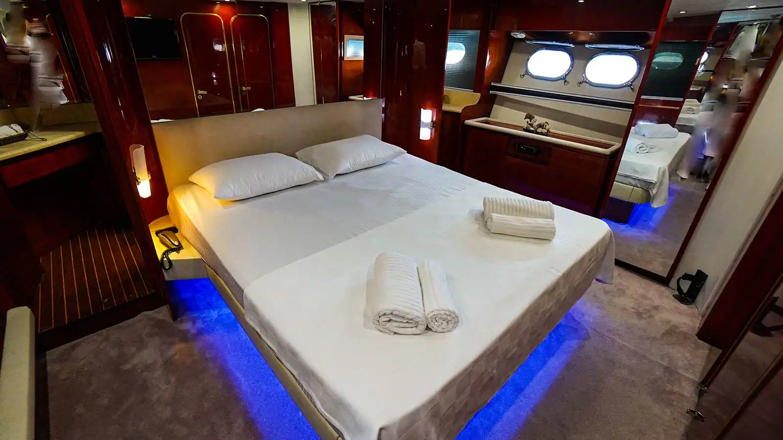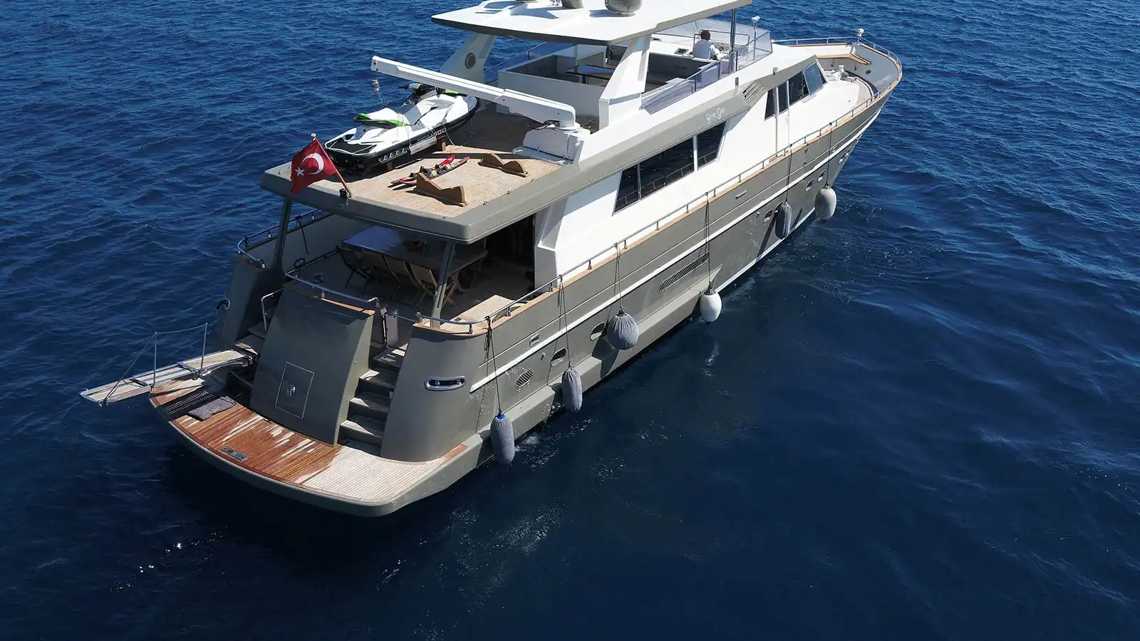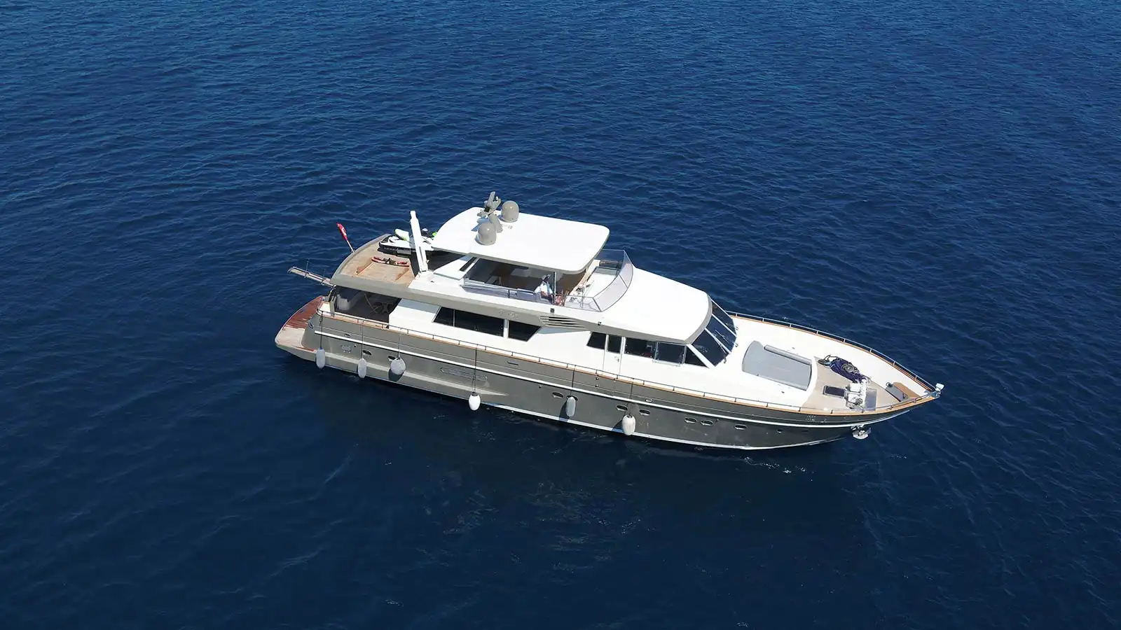 2000 yapımı ve 2019'da kapsamlı renovasyondan geçen bu 26 metre lüks motoryat, zarif tasarımı ve şık yaşam alanlarıyla motor yat deneyimini en üst seviyeye taşıyor. 6 metre genişliğindeki gövdesiyle 2 master ve 2 triple olmak üzere 4 klimalı kabinde her birinde özel duş ve WC bulunmaktadır. Salonda LCD TV, DVD oynatıcı ve müzik seti mevcuttur. Türk sularında geçerli Wi-Fi internet hizmeti sunulmaktadır. Telsiz, GSM telefon ve seyir cihazlarıyla güvenli seyir sağlanan tekne, Bodrum, Marmaris, Fethiye ve Göcek gibi en popüler mavi tur rotalarında profesyonel mürettebat eşliğinde hizmet vermektedir.