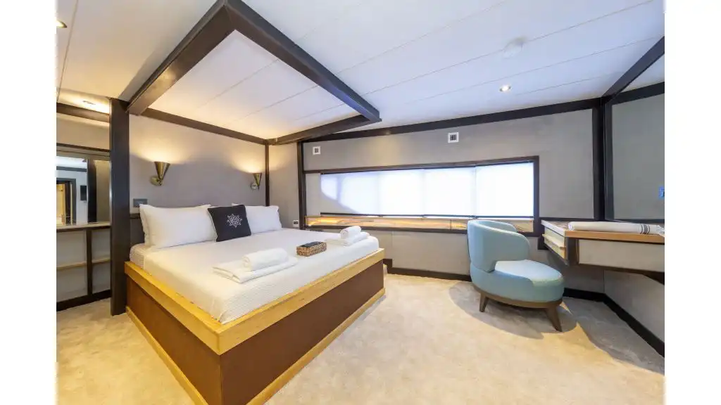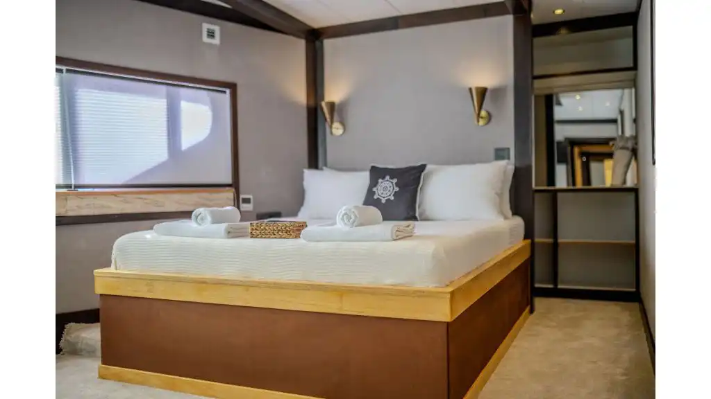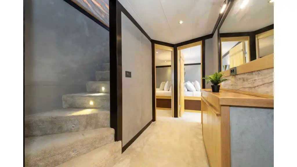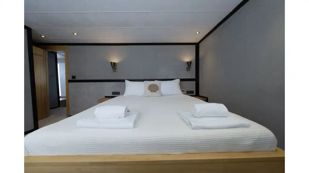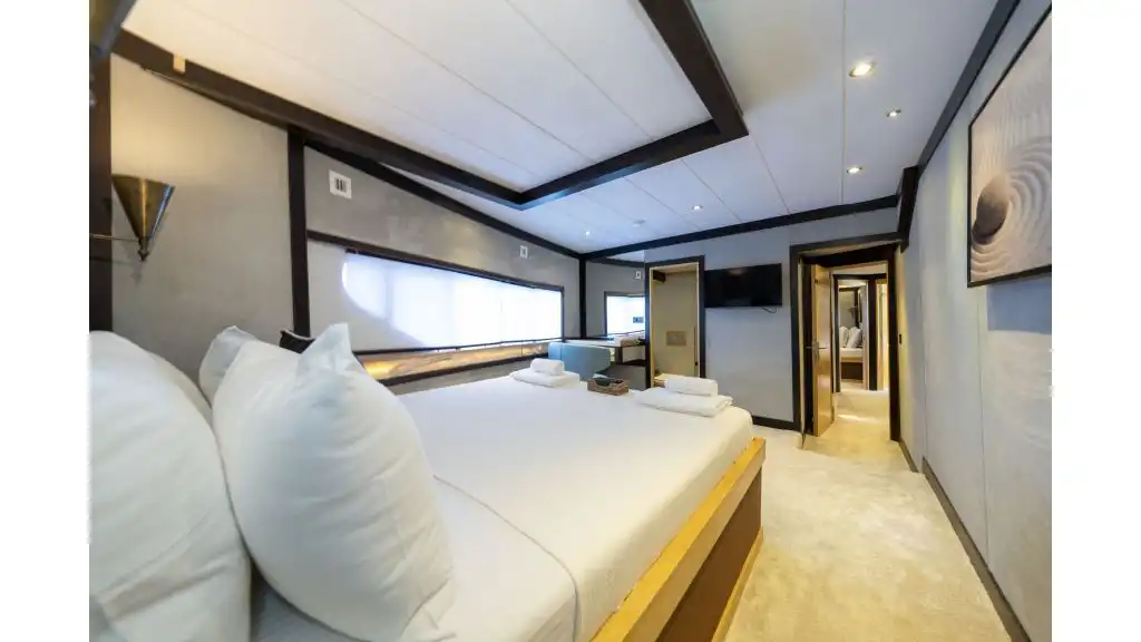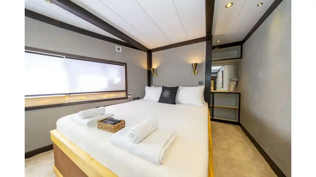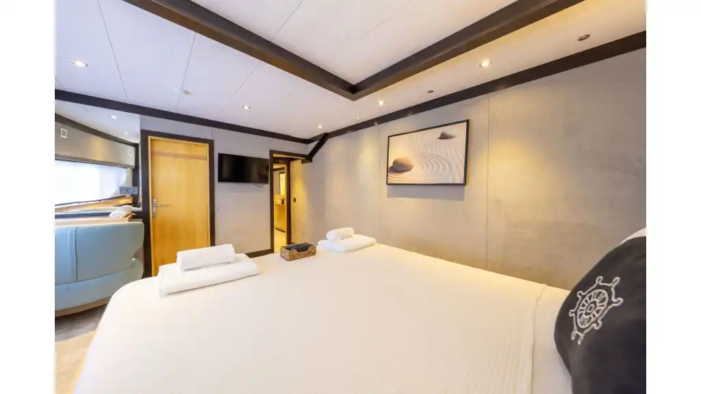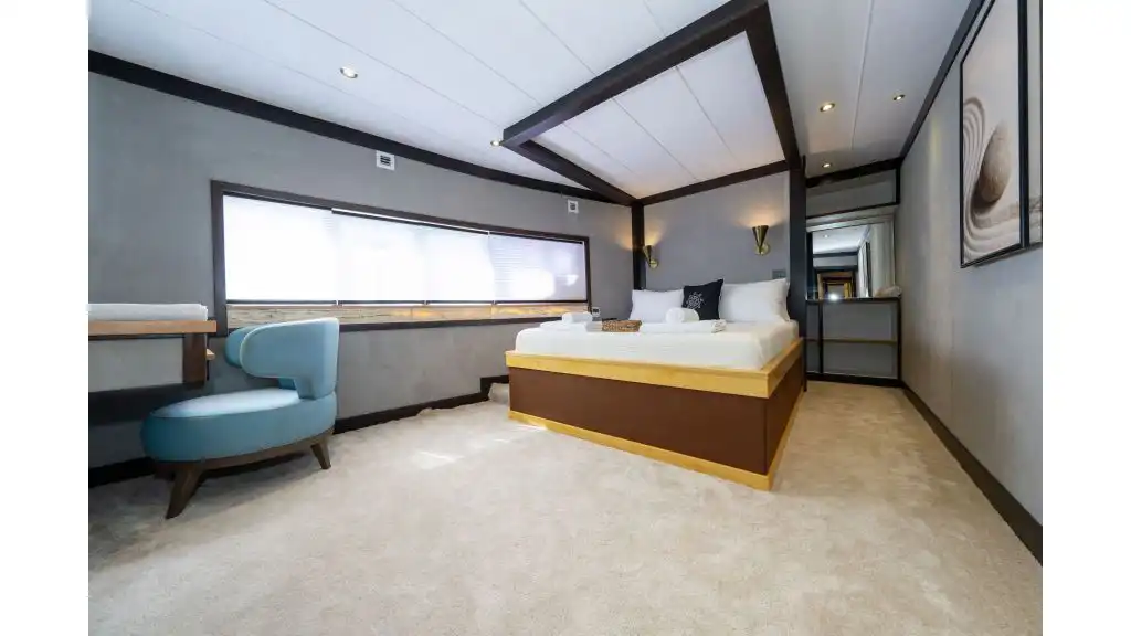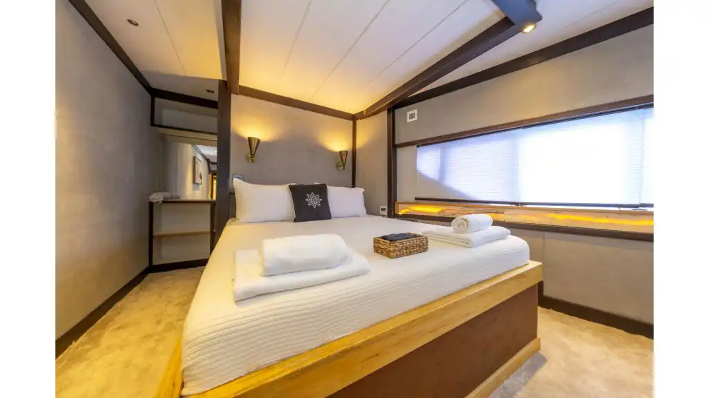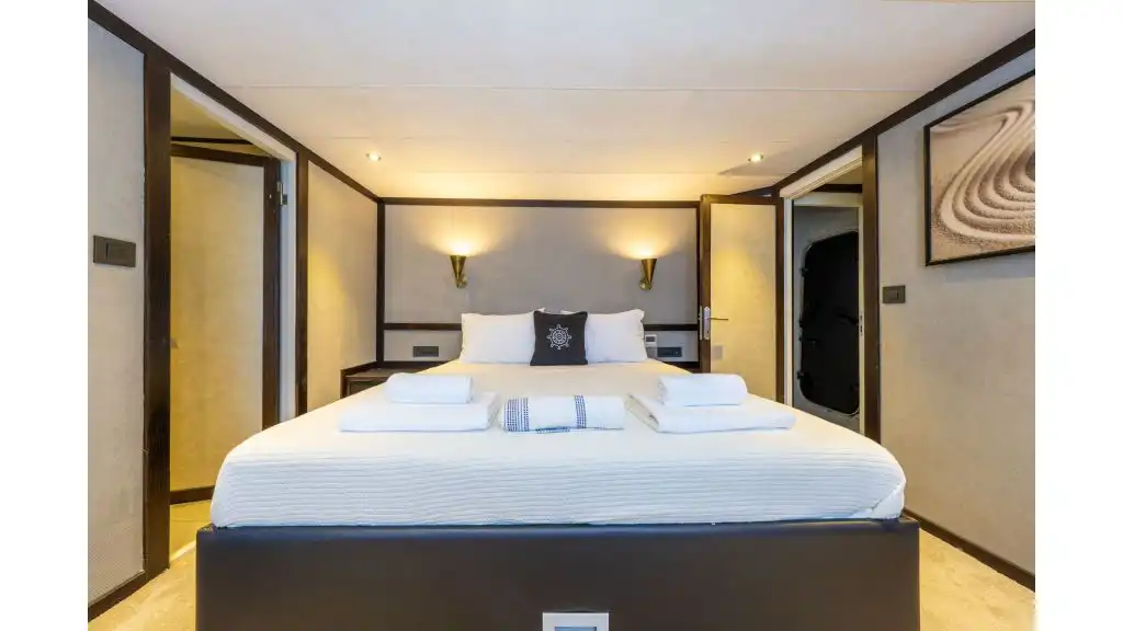 12 misafir kapasiteli bu teknenin en dikkat çeken özelliği, giriş katında (ana güverte) bulunan ferah Master Kabinidir. Bu sayede merdiven kullanımı gerektirmeden panoramik manzaralı lüks bir konaklama sunar.